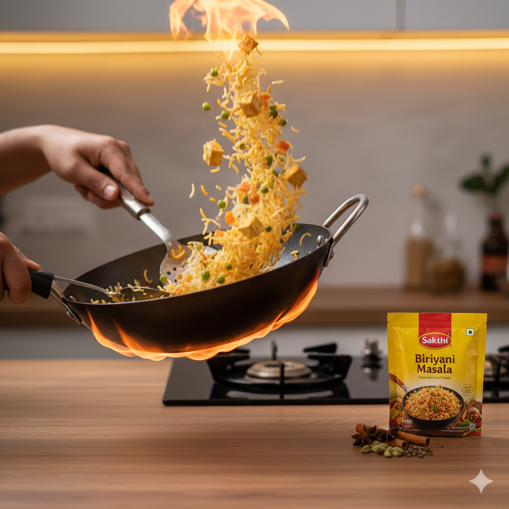 Cook rice and meat/vegetables with onions, tomatoes, and a generous spoon of Sakthi Biryani Masala to prepare a delicious, aromatic biryani that pairs perfectly with raita, salan, or boiled egg.