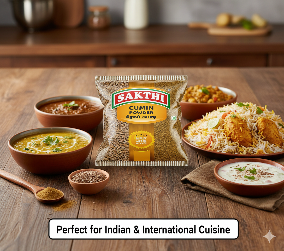 Sakthi Cumin Powder is a finely ground spice made from the highest quality cumin seeds, carefully cleaned, roasted, and milled to preserve their distinct aroma and earthy flavor. It is one of the essential spices in Indian cooking, enhancing the taste of curries, dals, gravies, rice dishes, and even snacks.
