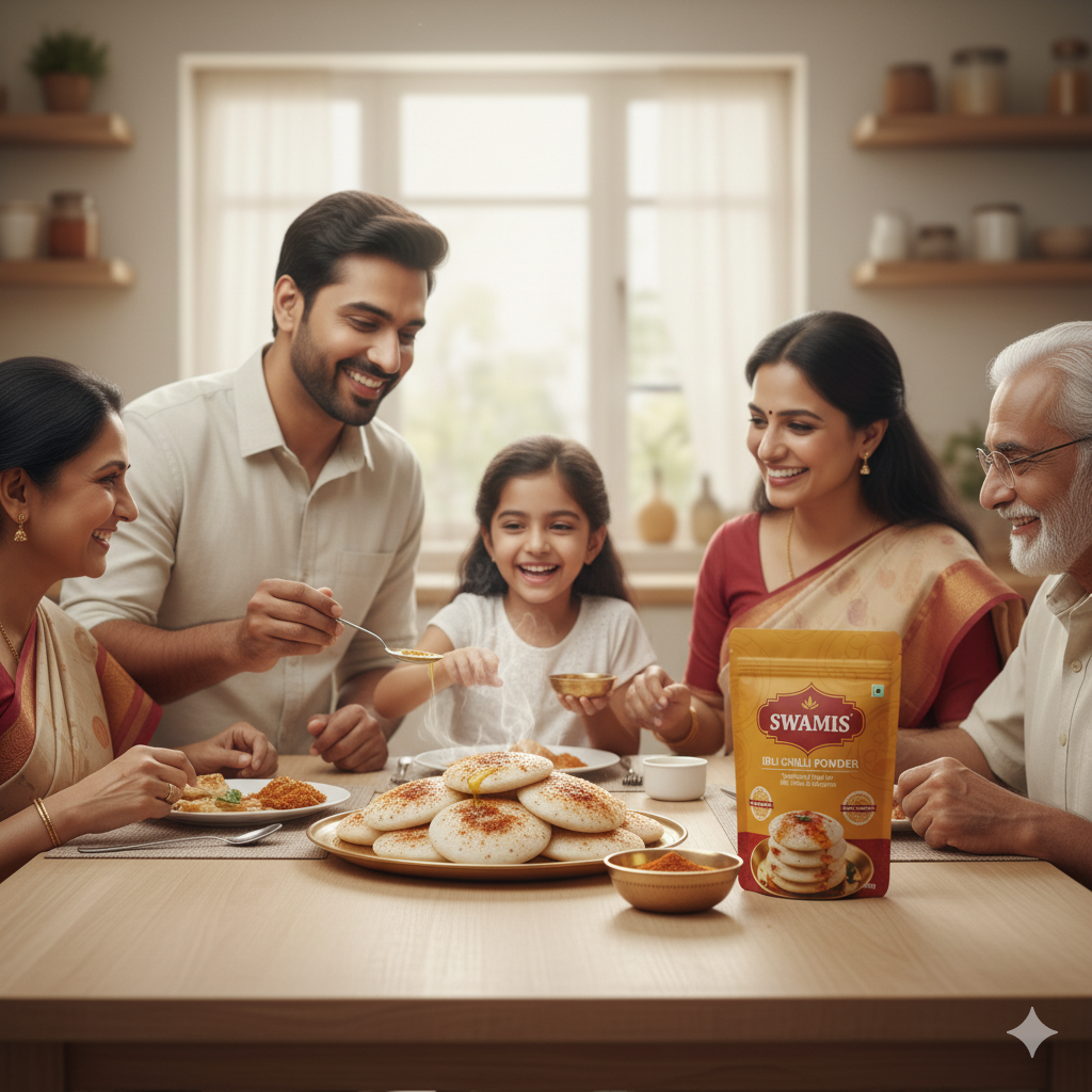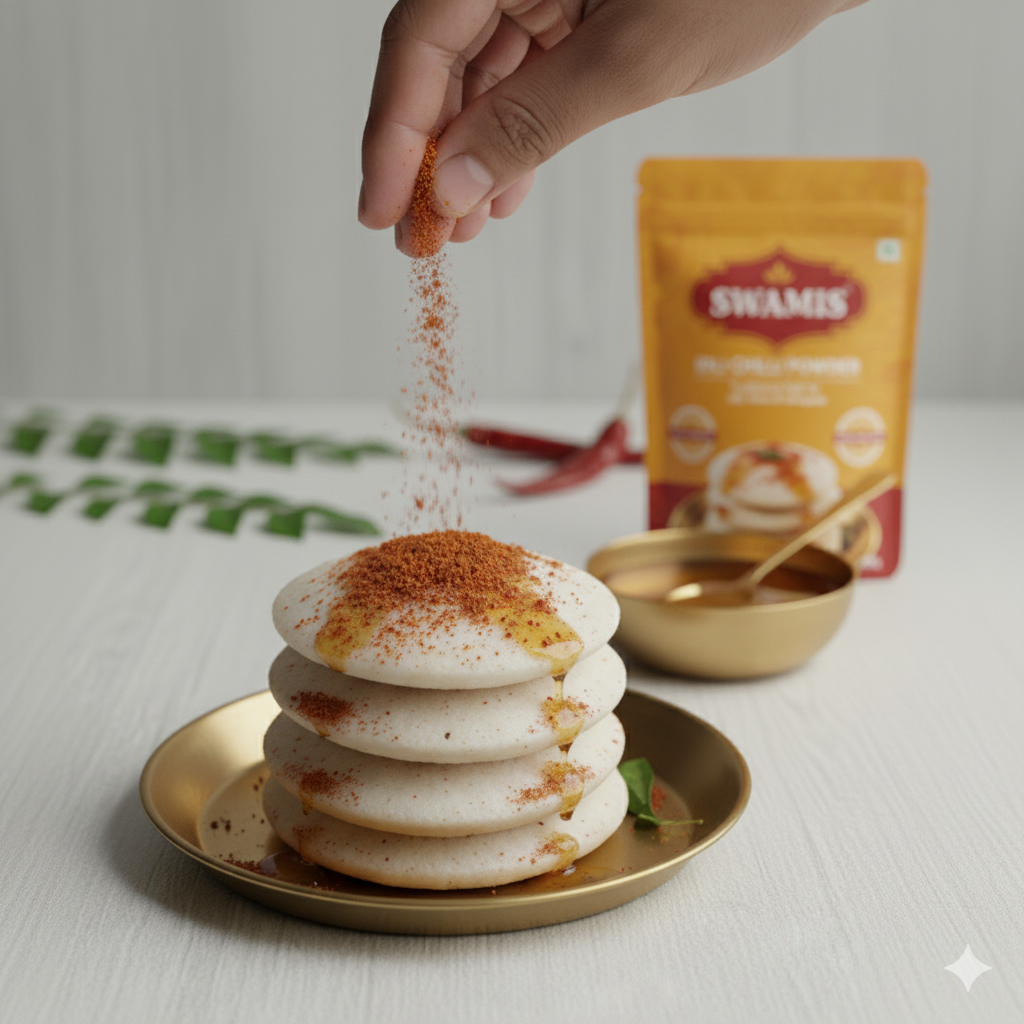 Add a spicy and flavorful twist to your breakfast with Swamis Idly Chilly Powder, popularly known as Idli Podi or Gunpowder. Made from a blend of roasted lentils, red chillies, sesame seeds, curry leaves, and aromatic spices, this traditional Kerala chutney powder enhances the taste of idlis, dosas, and uttapams. Just mix it with gingelly oil or ghee for a mouthwatering side dish. Prepared with 100% natural ingredients and free from artificial colors, flavors, or preservatives, Swamis Idly Chilly Powder is a healthy and authentic choice for every South Indian kitchen.